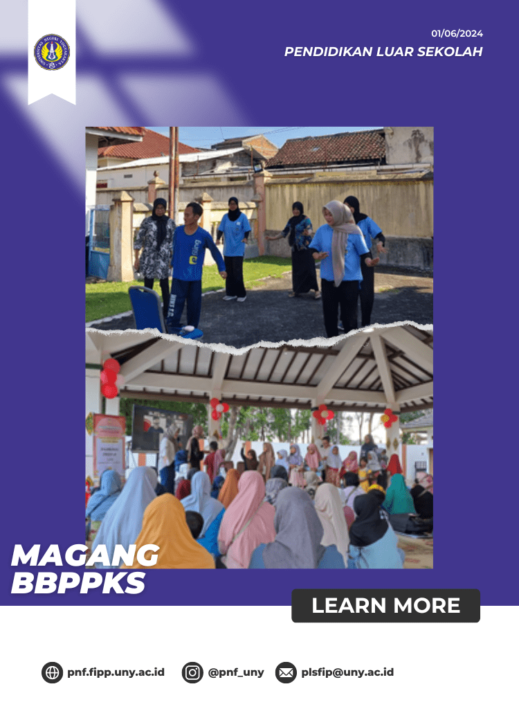 Mahasiswa praktik pekerjaan sosial di BBPPKS Yogyakarta atas nama Tiara Martiansyah, Salma Nur Alifah, Raden Rara Grhayu Makhesya, Neimada Ganis Maharani, Fi’la Afifah Nuqaya, dan Faizah Asmawati yang merupakan mahasiswa Departemen Pendidikan Nonformal semester enam (6) angkatan 2021. Kegiatan selama praktik jurusan antara lain: