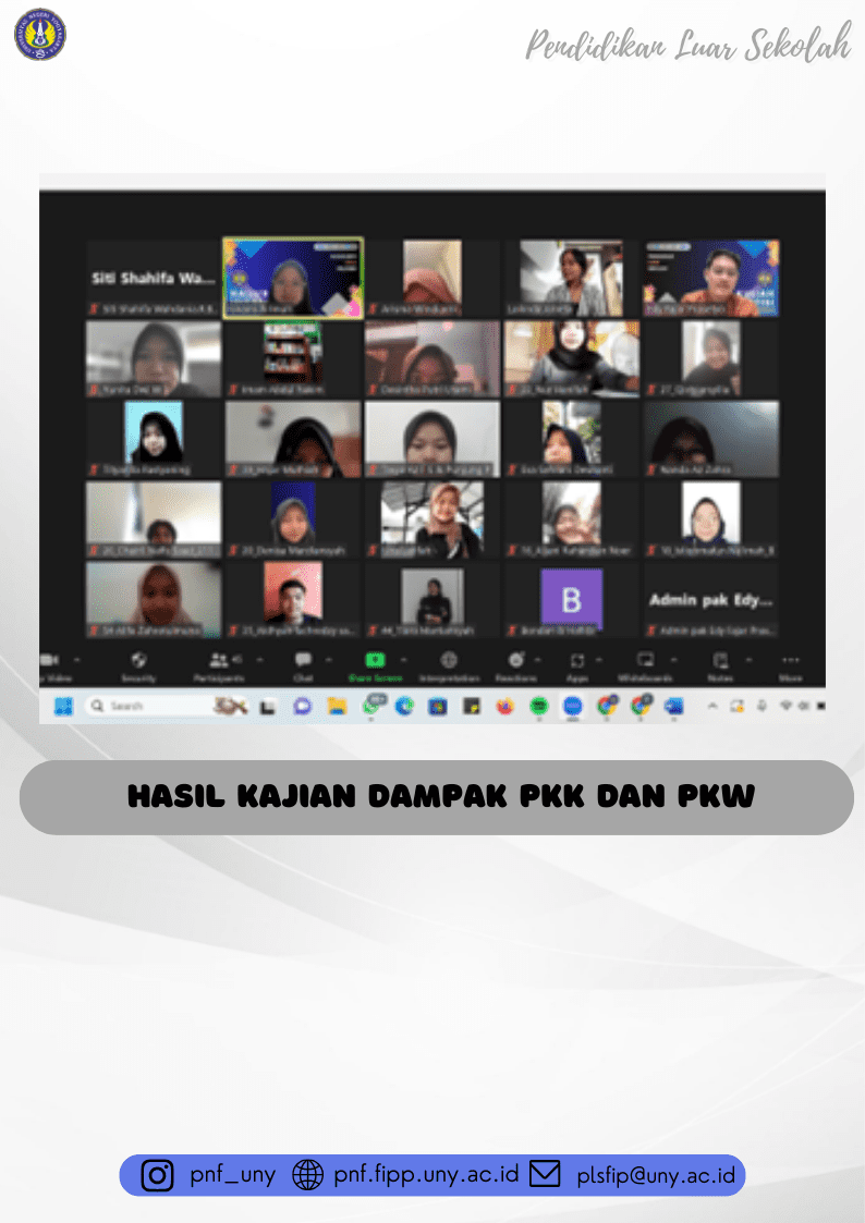 Pada hari Jumat (5/01/2024), Dalam rangka memperoleh informasi hasil Kajian Dampak Program PKK dan PKW tahun 2020-2022 yang dilakukan oleh Dirjen Pendidikan Vokasi bersama dengan Tim Evaluasi Dampak PKK dan PKW mengadakan pertemuan melalui Zoom Meeting. Pertemuan ini dihadiri oleh Direktur Jenderal Pendidikan Vokasi, Sekretaris Ditjen Pendidikan Vokasi, plt. Direktur Kursus dan Pelatihan, Koordinator di Direktorat Kursus dan Pelatihan, Kasubag TU Direktorat Kursus dan Pelatihan, Kasubag TU Setditjen Vokasi, Tim Pelaporan Setditjen Pendidikan Vokasi, Wakil Rektor Akademik, Kemahasiswaan dan Alumi UNY, Wakil Dekan Akademik Kemahasiswaan dan Alumni FIPP UNY, Prof. Dr. Sujarwo, M.Pd. dan Tim Evaluasi PKK dan PKW UNY.