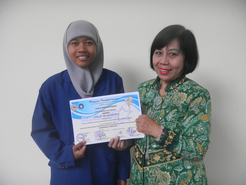 Laila Nur Rosyidah, Mahasiswa Bidikmisi Universitas Negeri Yogyakarta (UNY) meraih juara I pada Lomba Esai Mahasiswa di Universitas Lambung Mangkurat, beberapa waktu yang lalu. Lomba tersebut digelar oleh Hima fisika dalam serangkaian acara Moment Of General Physics Education 8-9 Maret 2014