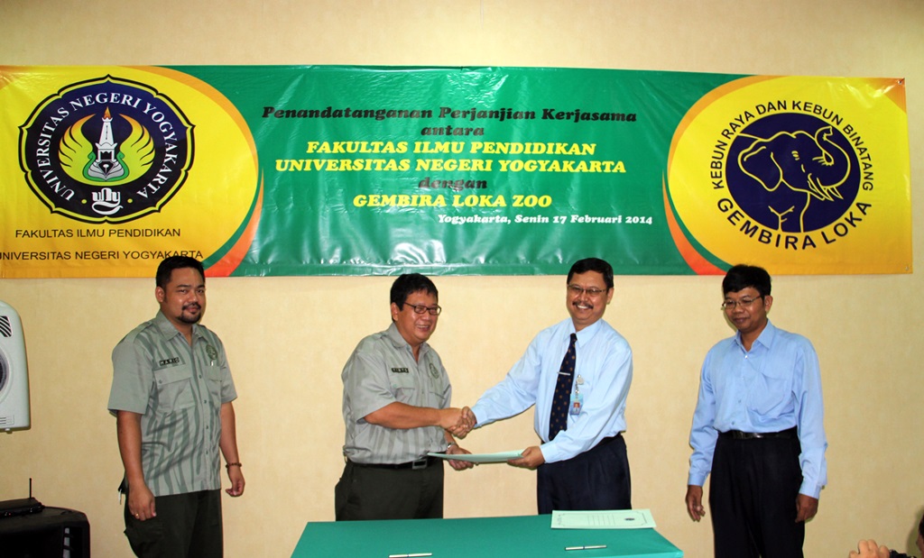 Penandatanganan kerja sama dilakukan oleh Dirut GLZoo KMT A.Tirtodiprojo (Joko) dan Dekan FIP UNY Dr Haryanto MPd, di Mayang Tirto kompleks kebun binatang setempat, Senin (17/2). Acara disaksikan Direktur/Manager Operasional GLZoo BPH Hario Danardono dan Kajur PLS FIP UNY Dr. Sujarwo, MPd.